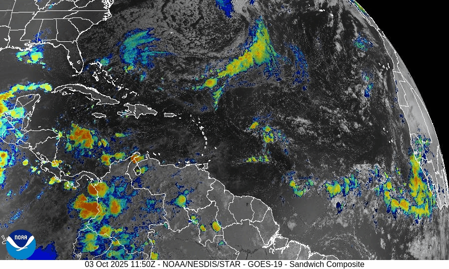 The Gulf of America and Caribbean remain calm with no organized tropical systems. Only typical late-season convection (afternoon storms) is present.