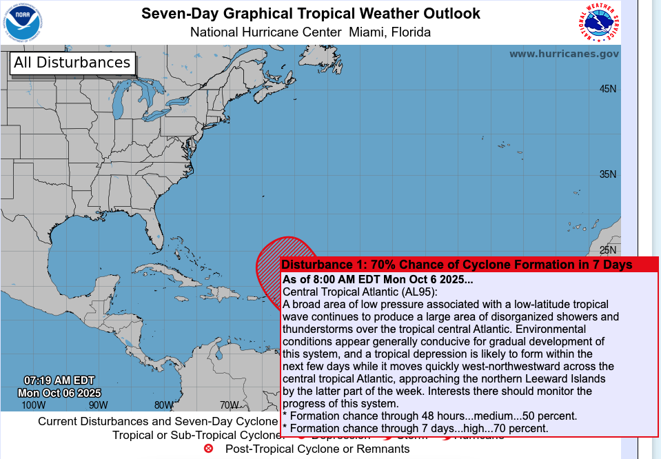 On October 6, a tropical disturbance in the central Atlantic maintains a 70% chance of development according to the National Hurricane Center. The system remains disorganized but is moving through warm waters conducive to gradual formation. Environmental factors like dry air and moderate wind shear are slowing intensification. Florida and the Gulf of America remain free of direct tropical threats.