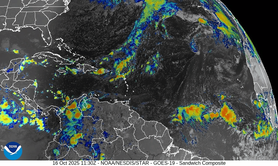 On October 16, Tropical Storm Lorenzo continues to weaken while tracking northeast over the central Atlantic with winds around 40 mph. Increasing wind shear, cooler waters, and dry air are causing the system to lose strength. No other tropical development is expected across the basin, and Florida and the Gulf of America remain quiet aside from minor marine swells and rip current risks.
