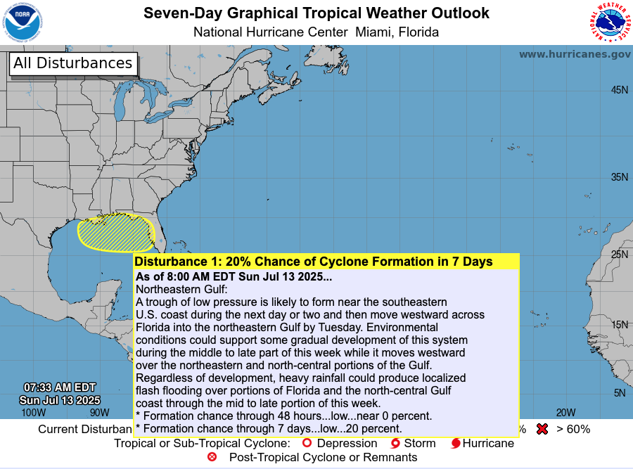 Atlantic Hurricane Outlook – July 13, 2025: Tropics Quiet, Gulf Trough Under Watch