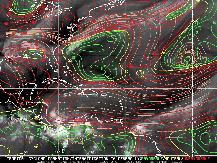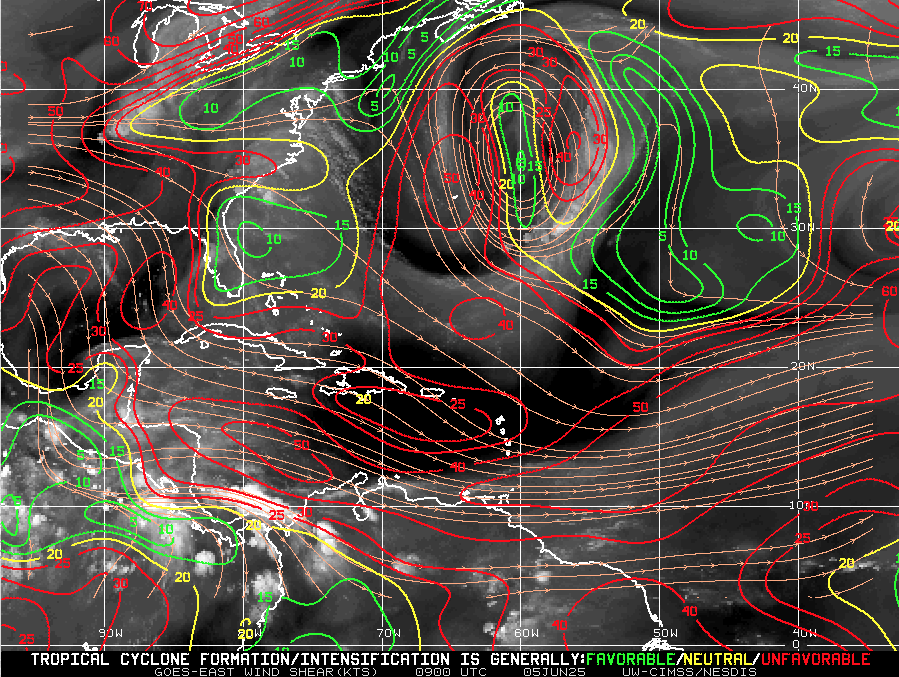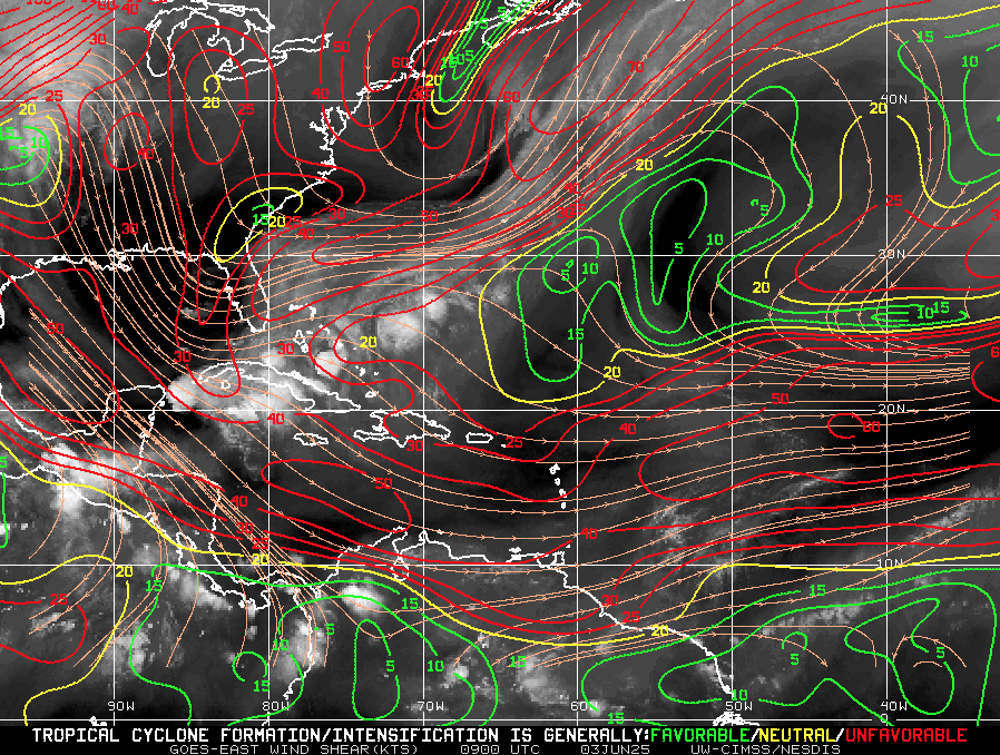 Wind shear remains moderate-to-high, particularly in the eastern Atlantic—temporarily limiting development