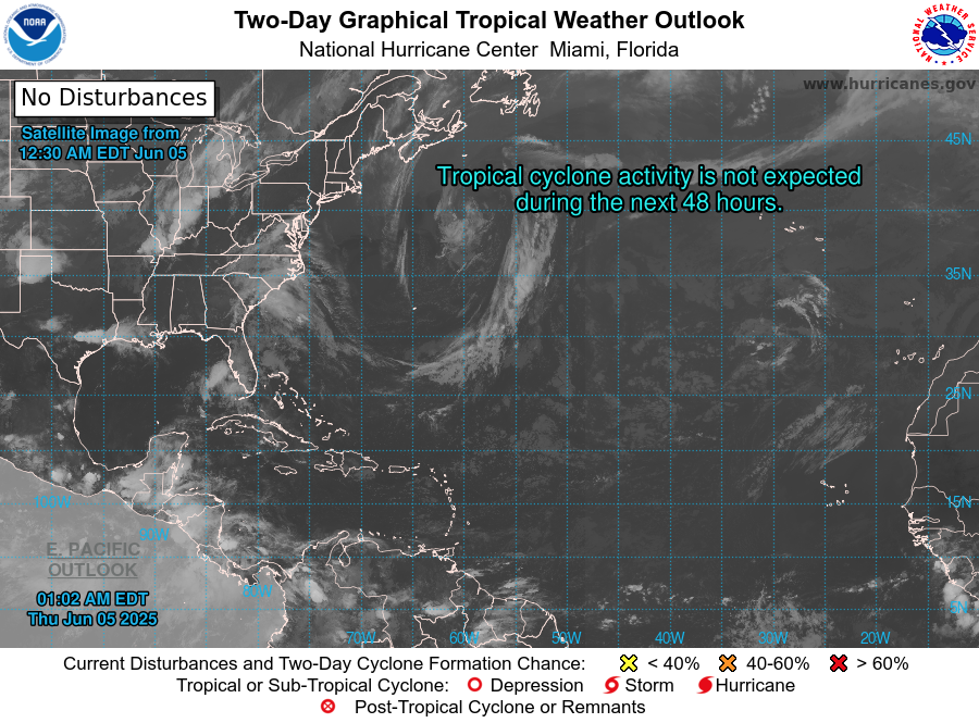 NHC forecast maintains zero development chances across the basin