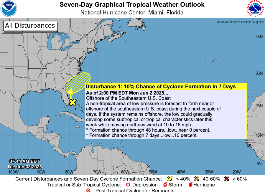 The Atlantic basin remains calm today, with no active named storms. However, meteorologists are tracking a low-pressure trough emerging off the Southeast U.S. coast, gradually drifting into the Gulf of Mexico. This system has a low (20%) chance of organizing into a subtropical or tropical system later this week .