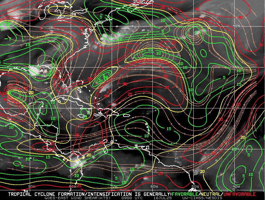 Wind Shear: Still elevated in the western Atlantic and Gulf, but beginning to weaken, particularly near Central America and the western Caribbean.
