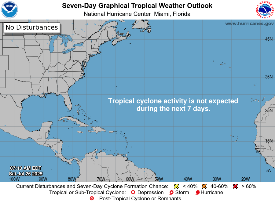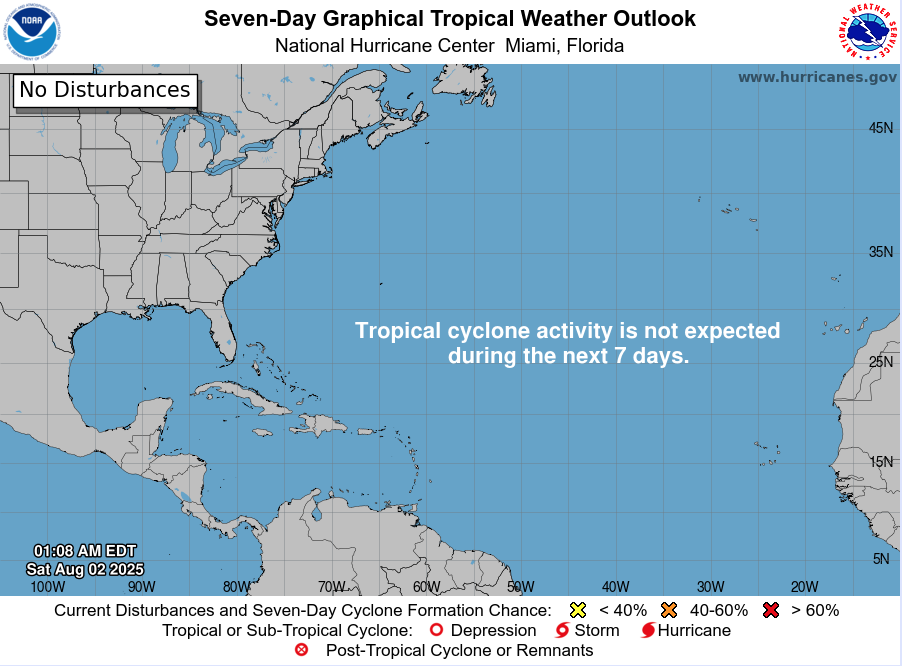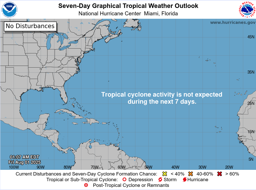 The 8 AM EDT Tropical Weather Outlook confirms no systems expected to form within seven days.