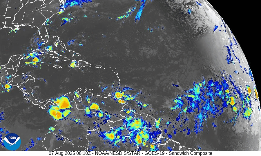 A tropical wave near 45°W continues to show signs of organization. Environmental conditions feature warm sea surface temperatures but are partially offset by moderate wind shear and Saharan Air Layer (SAL) dust intrusion. Development chances: 30% over 7 days.Far Eastern Atlantic Wave (off Africa):