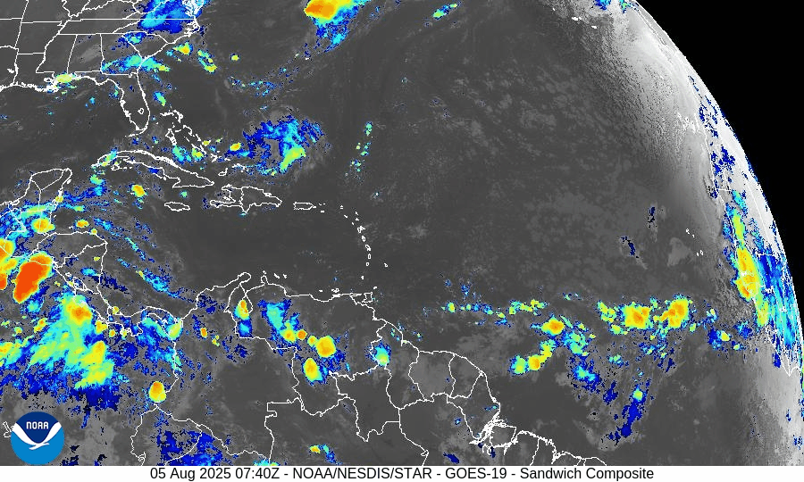 Hurricane Erin is now a Category 2 offshore system, still driving dangerous surf and rip currents up the East Coast. The Gulf of Mexico and Florida stay quiet with only scattered thunderstorms, while the central Atlantic wave shows some development potential but is being held back by wind shear and Saharan dust.