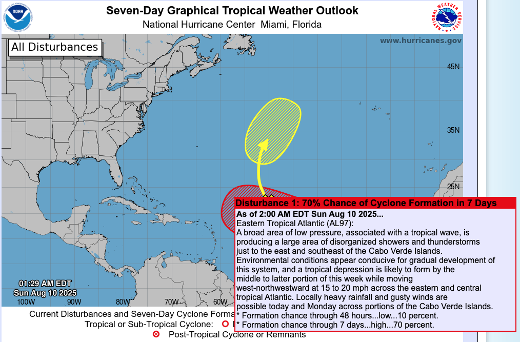 Central Atlantic Wave (Invest 99L): Located ~1000 mi WSW of the Cabo Verde Islands. May briefly become a depression before moving into a less favorable environment. Formation chances: 50% (48 hr) / 60% (7 day).