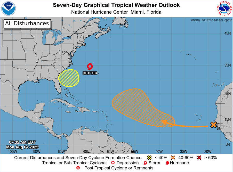 Dexter is weakening but remains watchable over open waters. The disturbance off Florida and the wave from Africa are the two main areas of tropical interest, each with moderate development odds this week. Persistent SAL and shear are still limiting, but conditions may shift toward favorability as August evolves.