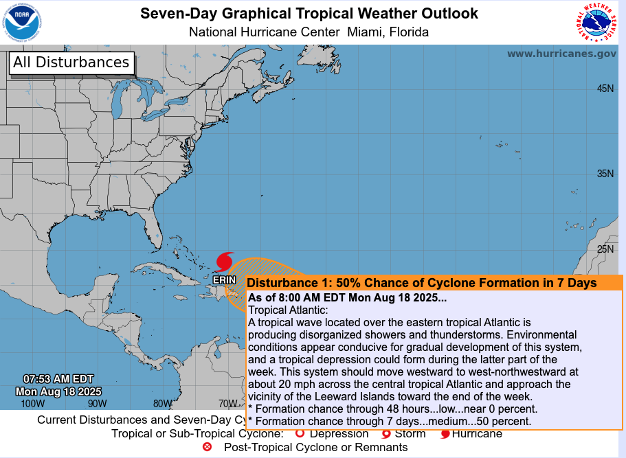 Erin has weakened slightly but remains a Category 2 hurricane as it tracks northeast, well offshore of the U.S. East Coast. The storm continues to generate dangerous swells, rip currents, and pockets of coastal flooding, especially from the Outer Banks northward into the Mid-Atlantic and New England. While direct landfall is not expected, coastal impacts remain significant.Disturbance in the Central Atlantic: