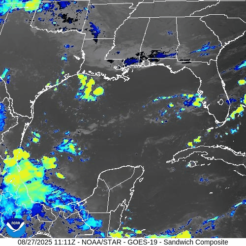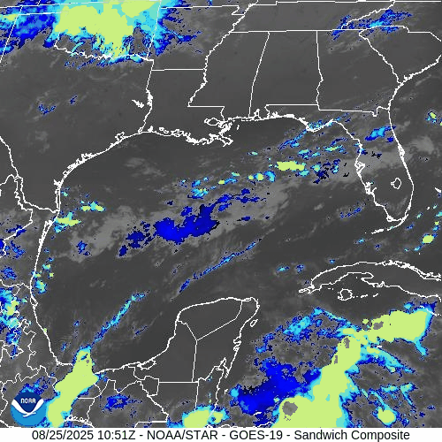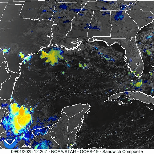 The Gulf remains quiet under high pressure, with no signs of organized development. Only routine afternoon thunderstorms are occurring along coastal regions. Despite very warm waters, the Gulf shows no near-term tropical threats.
