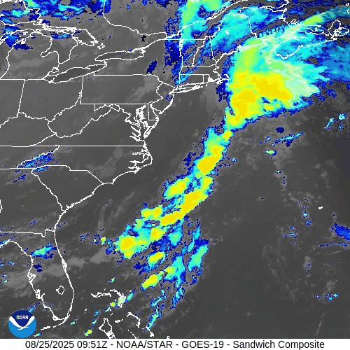 Tropical Storm Fernand continues east of Bermuda with sustained winds near 50 mph and will weaken as it moves into cooler waters. Erin’s legacy swells still drive dangerous surf and rip currents from the Carolinas to New England. Florida and the Gulf remain calm, with only routine summer thunderstorms.
