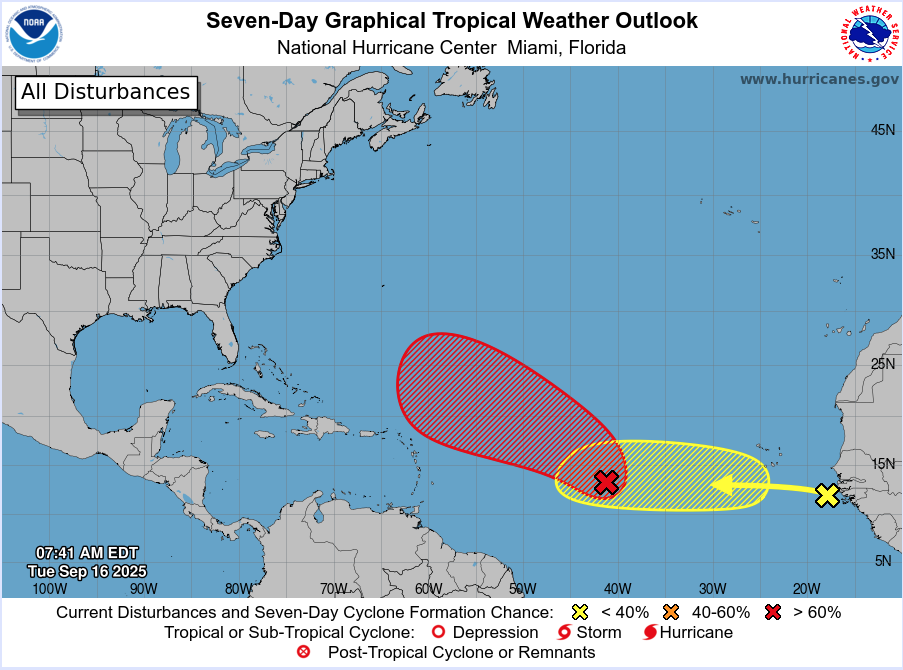 The Gulf and Caribbean remain quiet, with no tropical disturbances showing signs of organization. Weather in these areas continues to be typical for mid-September: heat, humidity, and scattered thunderstorms.