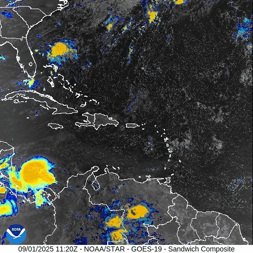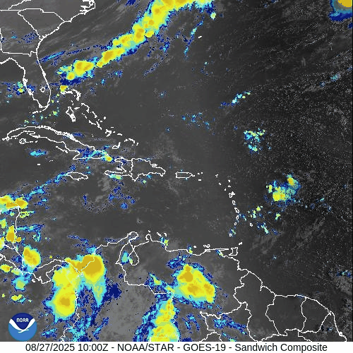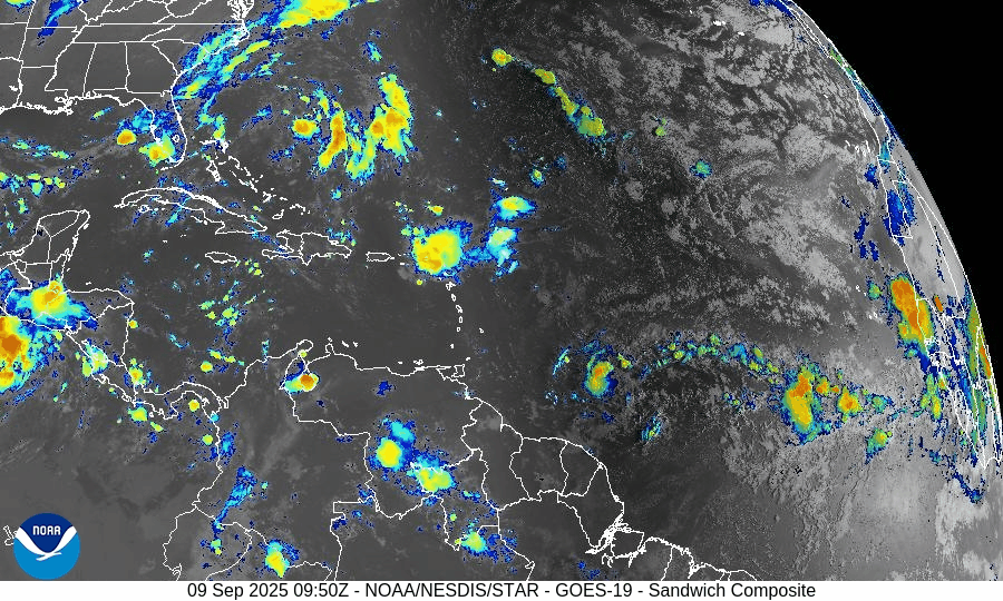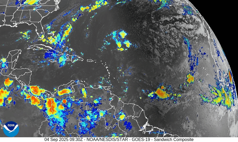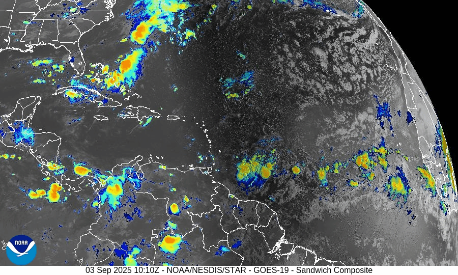 A tropical wave in the Caribbean and another in the central Atlantic show low development chances. The NHC assigns only a 10% probability of tropical formation through 7 days. Dry air and hostile shear continue to suppress organization.