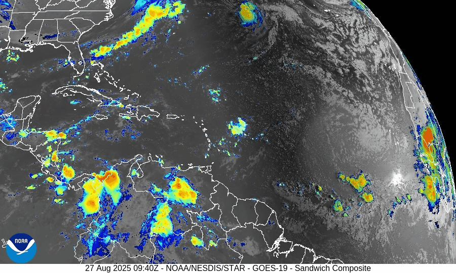 On August 27, Tropical Storm Fernand transitioned into a post-tropical system southeast of Newfoundland. While Fernand poses no threat to land, Erin’s long-period swells continue to drive dangerous surf and rip currents from the Carolinas through New England. Florida and the Gulf of Mexico remain calm, with only typical late-August thunderstorms and no signs of tropical development.